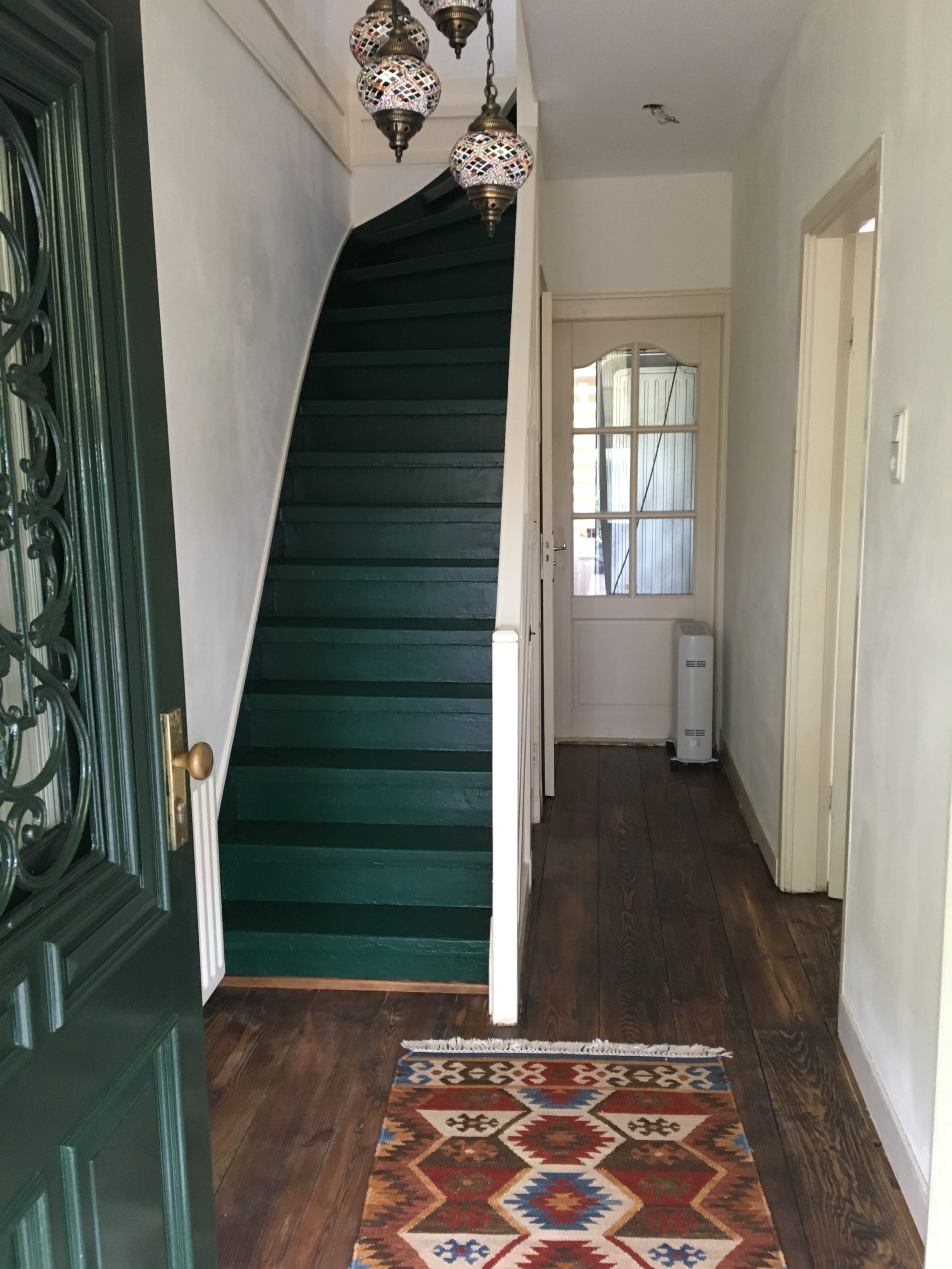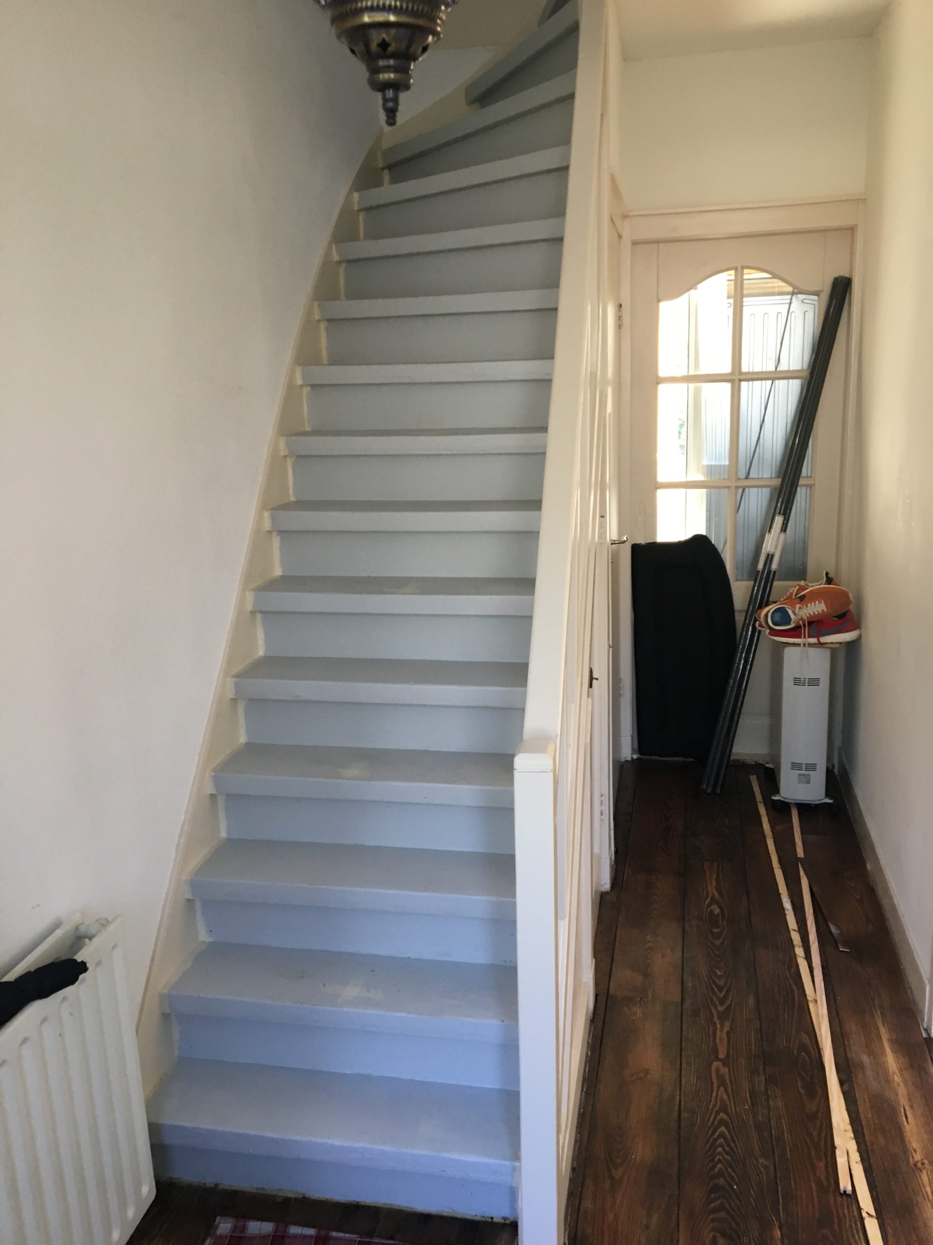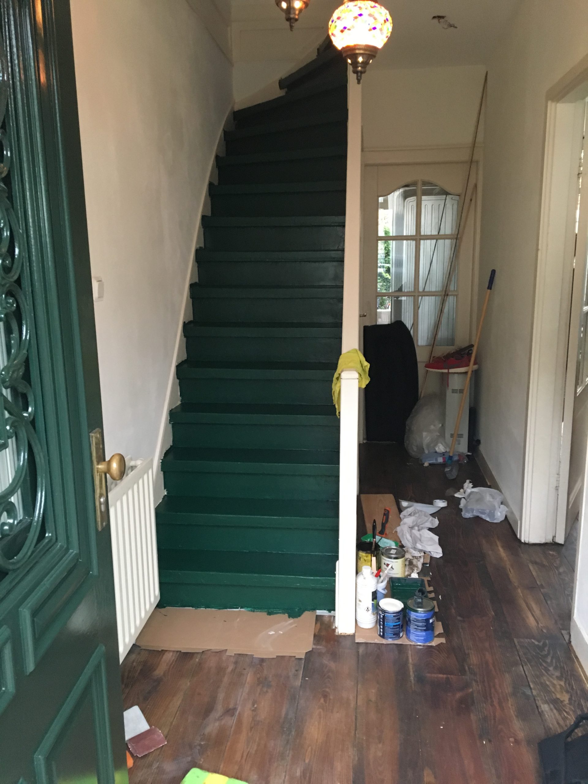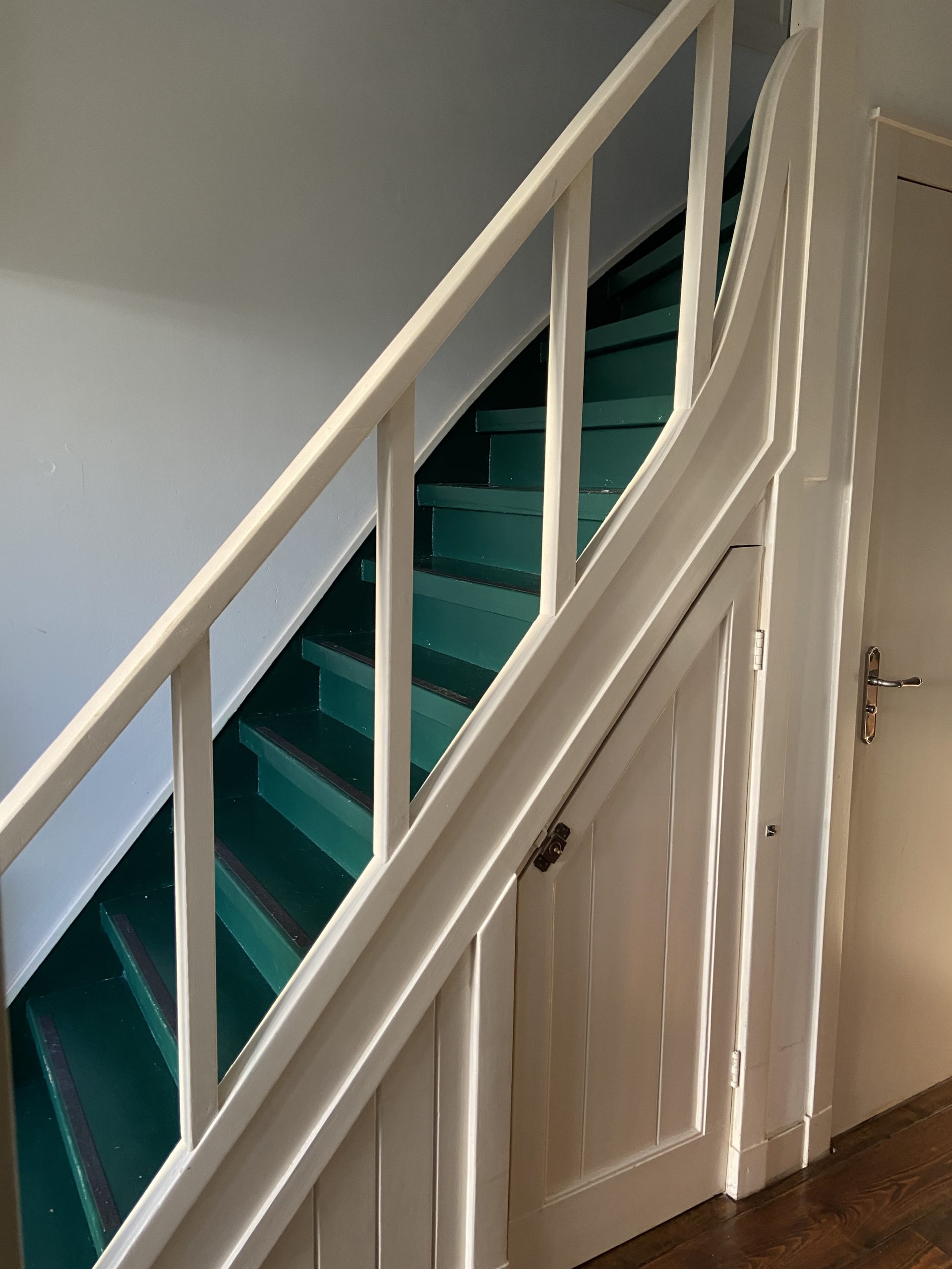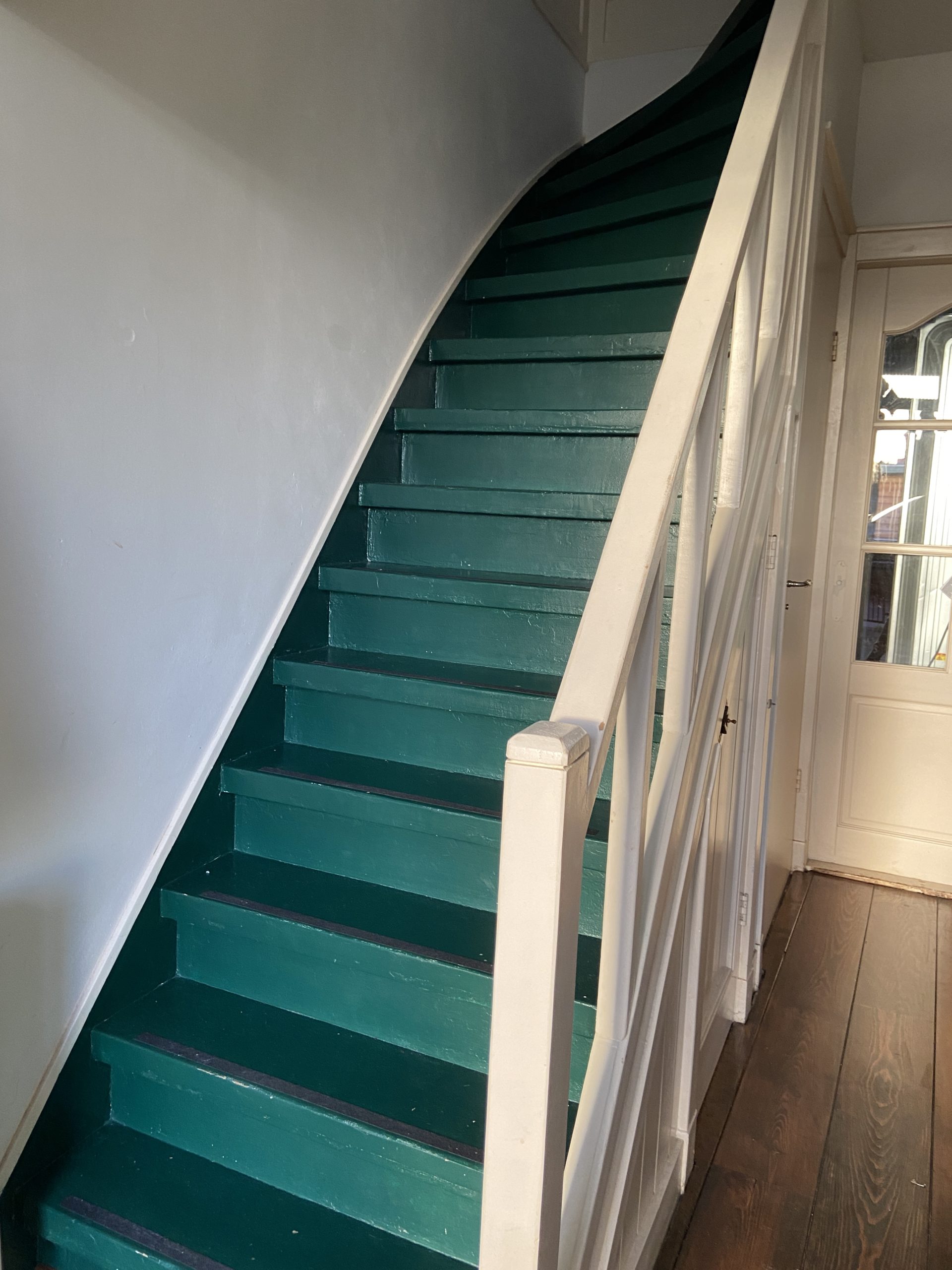 Een renovatie van een oude trap die voorzien was van tapijt en waar een trapleuning ontbrak. Het tapijt en de lijm zijn verwijderd, de traptreden hersteld, geschuurd en in Amsterdam Groen geschilderd. Passend bij de voordeur om de oude charme en het karakter van het huis te behouden. Een trapleuning is met de hand gemaakt en aan de open zijde van de trap gemonteerd. Het resultaat van de renovatie is een nieuwe frisse en veilige trap met trapleuning in de look en feel van het huis.