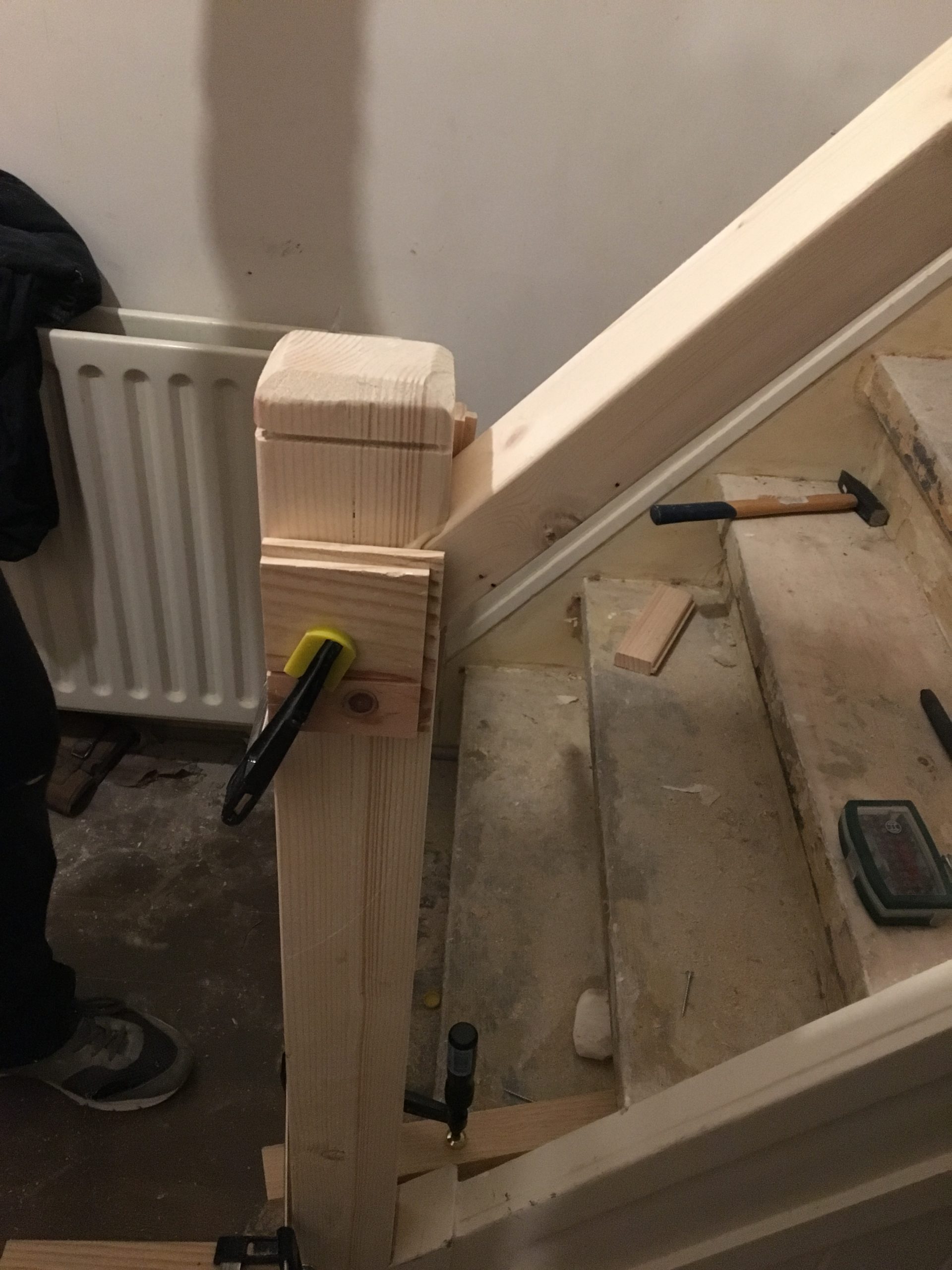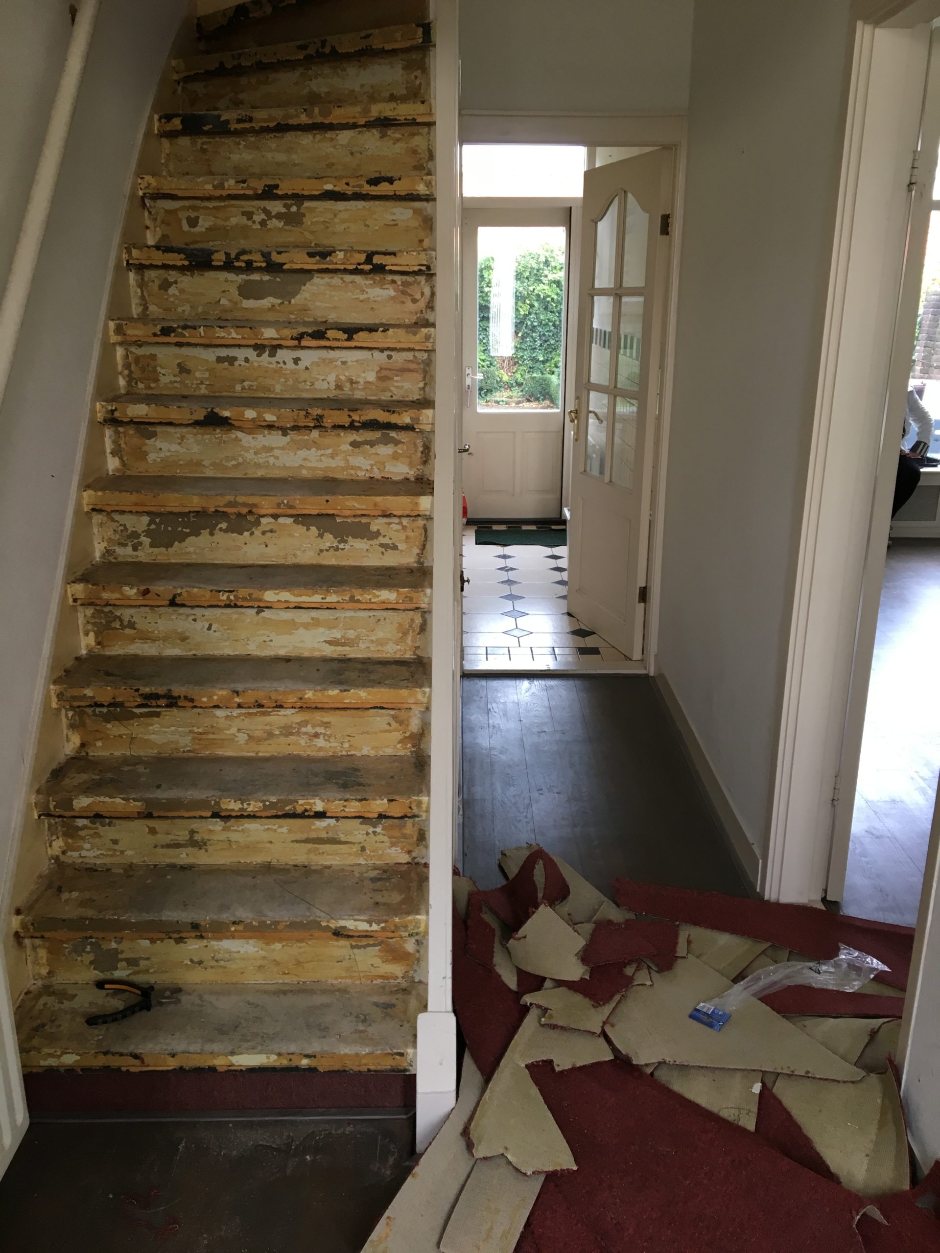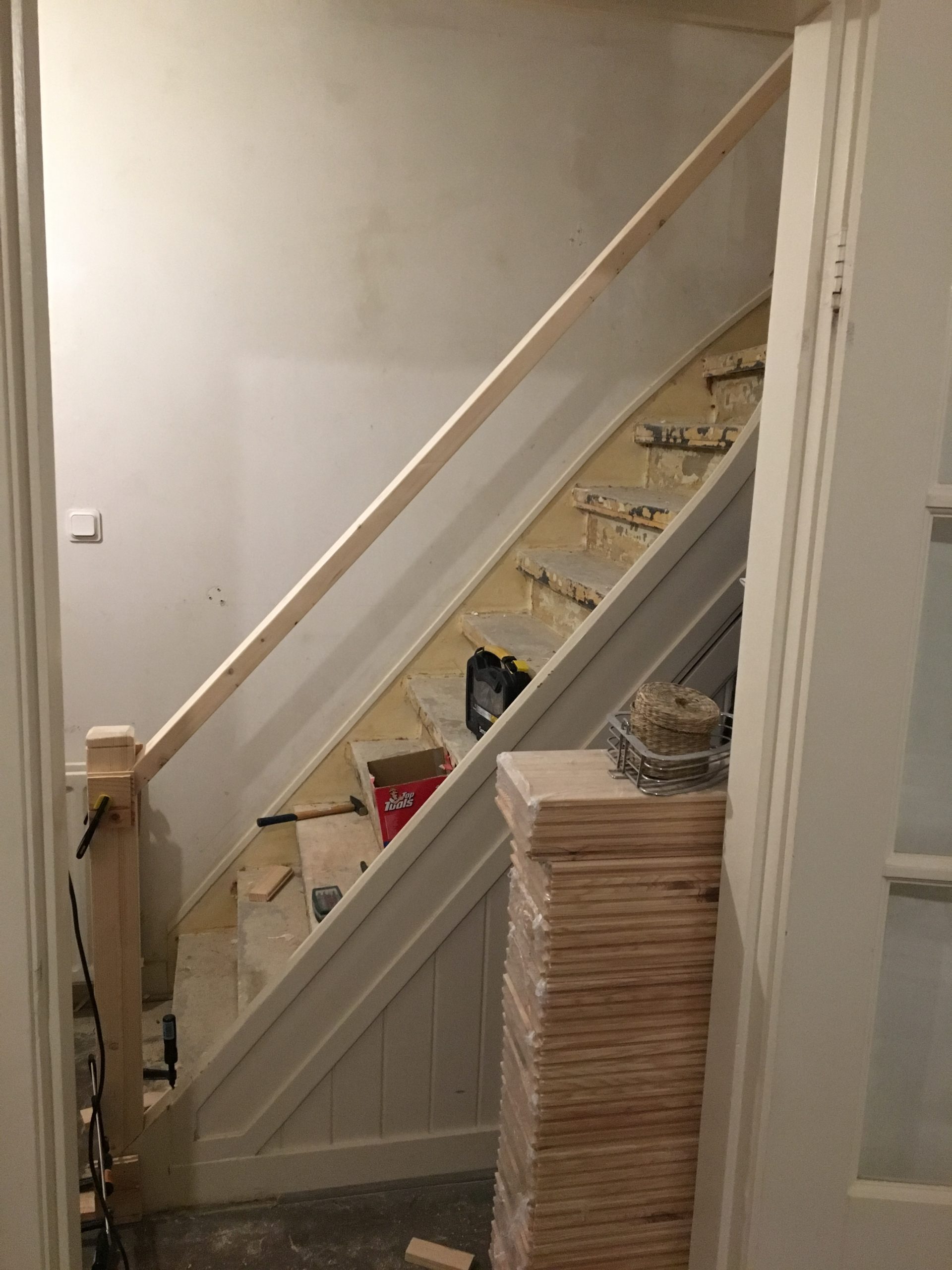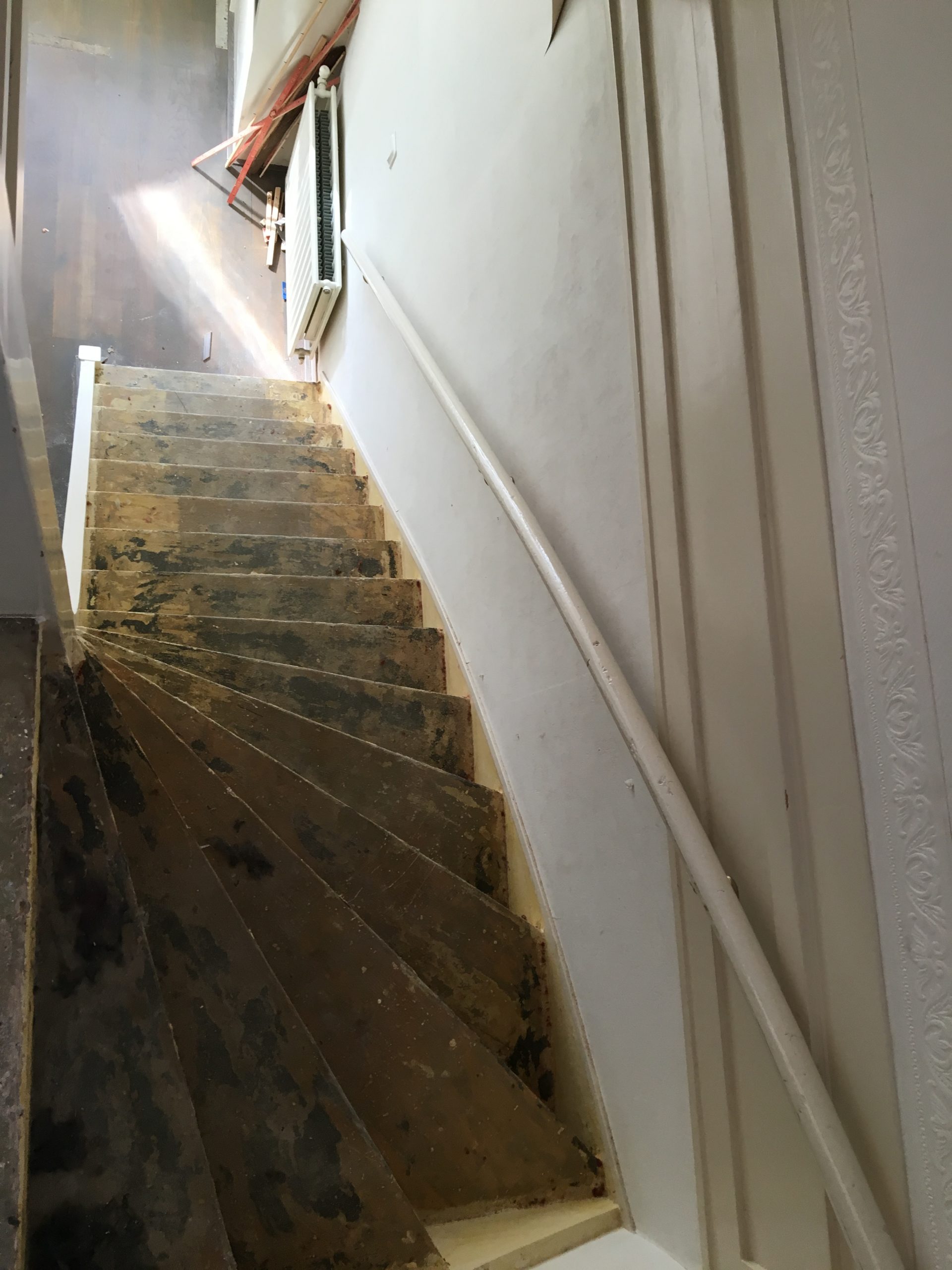 Een renovatie van een oude trap die voorzien was van tapijt en waar een trapleuning ontbrak. Het tapijt en de lijm zijn verwijderd, de traptreden hersteld, geschuurd en in Amsterdam Groen geschilderd. Passend bij de voordeur om de oude charme en het karakter van het huis te behouden. Een trapleuning is met de hand gemaakt en aan de open zijde van de trap gemonteerd. Het resultaat van de renovatie is een nieuwe frisse en veilige trap met trapleuning in de look en feel van het huis.